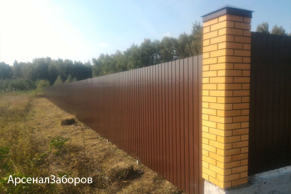 Конструкция забора из профлиста на ленточном фундаменте и с кирпичными столбами